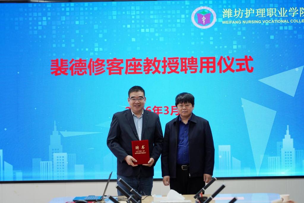 聘任仪式上,院长王文军向裴德修颁发潍坊护理职业学院 “客座教授” 聘书。王文军指出,中医药康养产业是学院未来发展的核心方向,裴德修先生的加盟,是学院深化产教融合、强化高层次专家引育的重要举措,有利于汇聚校内外优质资源,推动学院在学科建设、人才培养、科研攻关、产业服务等方面实现新突破,助力我院打造中医药特色办学品牌,更好服务区域大健康产业需求,推动中医药康养事业高质量发展。